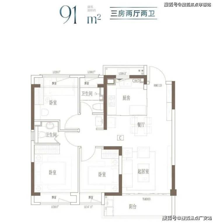 建面约91㎡ 3房2厅2卫▼