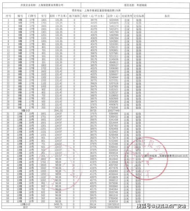 一房一价表发布: