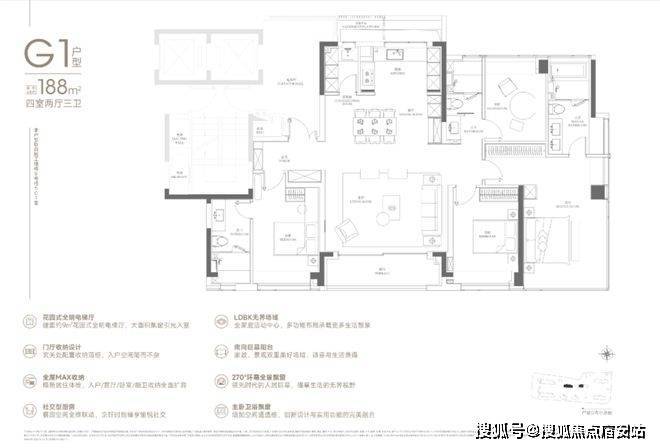 188户型2梯2户,有独立的电梯厅。4房3卫设计,✅✅中环置地中心望云售楼处电话:400-9692-958还是3明卫,这两点还是不错的。