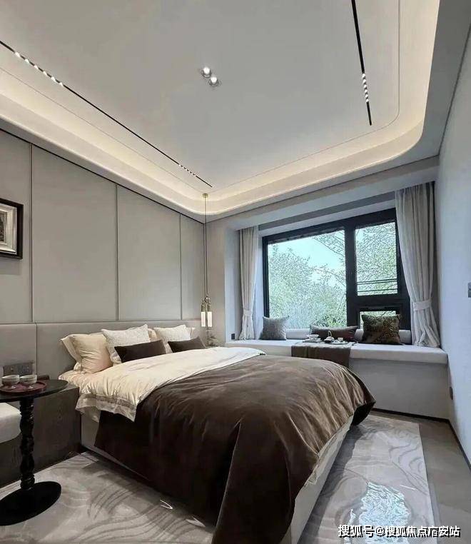 主卧转角落地窗+飘窗,也算是非常少见的了。净面宽约3.6m,不算进门的衣柜,进深大约5.7m左右。根据测算,✅✅中环置地中心望云售楼处电话:400-9692-958可以放置宽约2m的床+2个床头柜(宽度约45cm/个)是可以的。