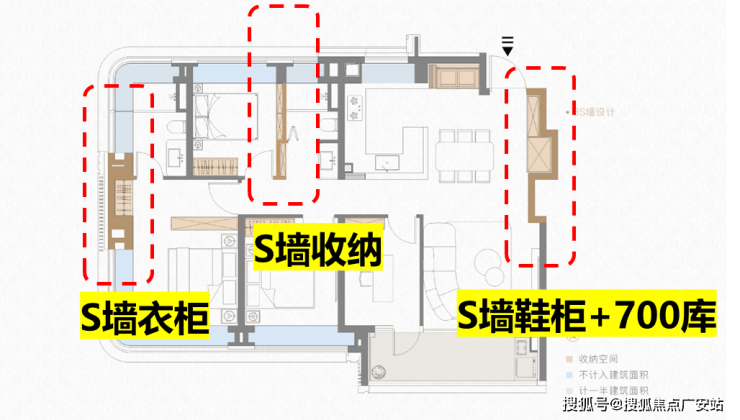 这个户型有独立电梯入户,保障私密性的同时,还多了一个独立都电梯厅,相当于多了一个小厅,可以用来规划摆放收纳柜,变相提高了“得房率”。
