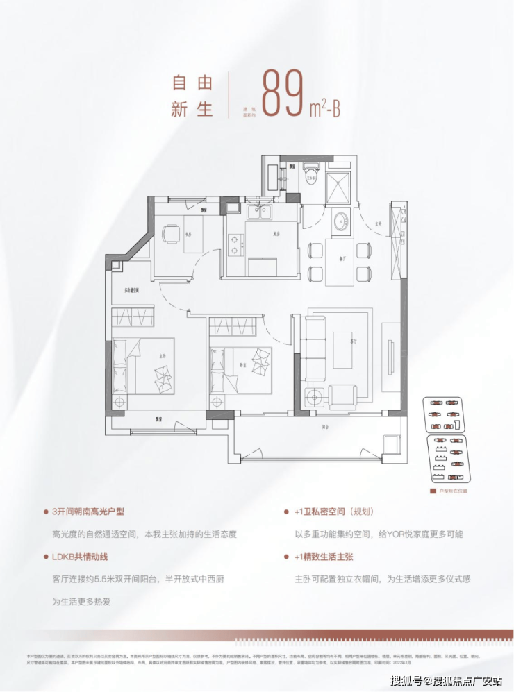 89㎡3房2厅2卫(规划)功能户型,入户洗手台规划设计,为业主在疫情常态化的新生活提供更健康的居家生活方式。