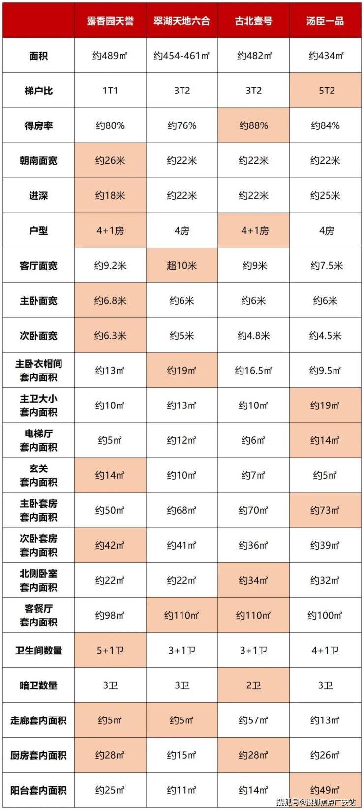 同时露香园·天誉约489㎡的得房率、走廊面积都有竞争力,其他各项参数也与另外三个指标性项目互有来回,包含玄关空间尺度、厨房空间尺度、次卧面积尺度,整体是一个以大面宽为核心竞争力,较为均衡的产品。