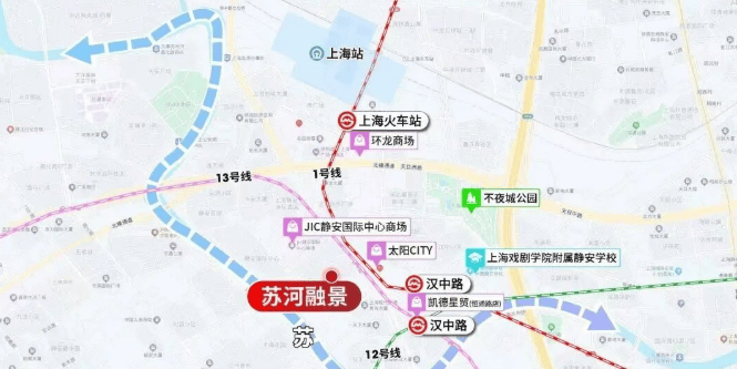 苏河融景,步行约188米1/12/13号线汉中路站!进站后2站人民广场,2站南京西路、2站北外滩!同时项目近邻东西大动脉北横通道、南北大动脉南北高架以及内环高架,自驾迅捷通勤全城!