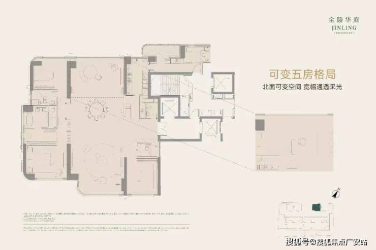 大平层的更新迭代往往从“厅”开始,金陵华庭将“厅”的面积占比提升,打造更多元的场景,在居住体验感上直接超越别墅。