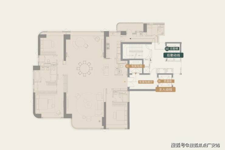 聚焦户型本身,四梯两户,奢享独立双动线。特设主人归家礼遇通道与家政后勤专线,生活起居与后勤服务互不干扰,尽显从容尊崇;专属电梯门厅,与室内空间一体化定制设计,主人可静享不被打扰的从容,安然有序的出入体验!