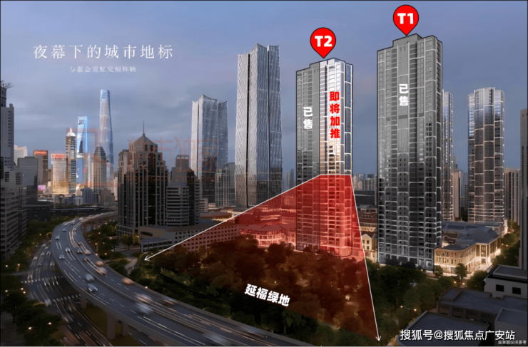 而从T2北望,延福绿地化作一幅绵延的生态画卷,让建筑的生长根植于自然脉络之中,实现了繁华城央与诗意栖居的完美融合。