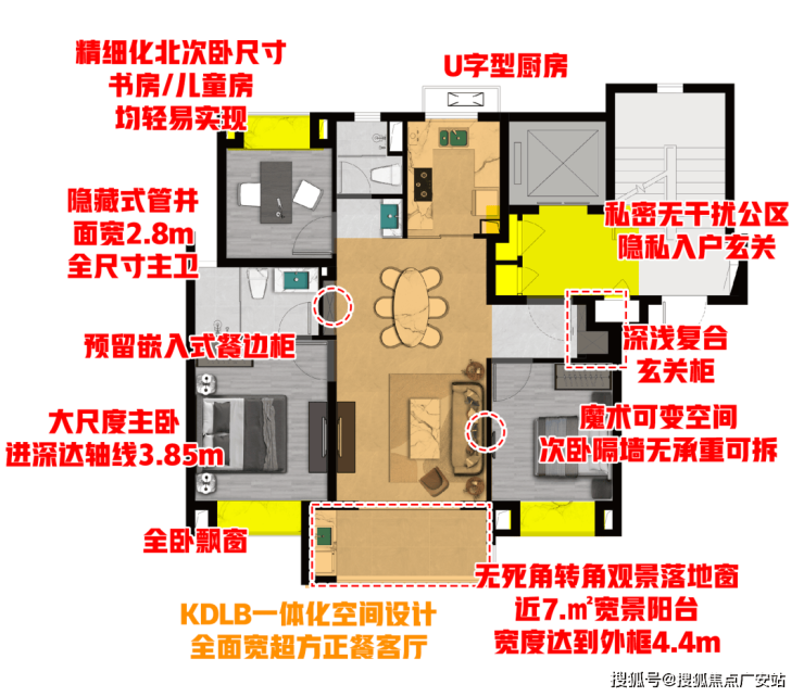 入户玄关及超大玄关柜设计,三开间朝南飞机户型, KDLB一体化设计,客厅次卧魔术可变空间,U型厨房,大尺度宽景阳台+转角观景落地窗,舒适北卧,三段式干湿分离客卫,全卧室飘窗,等等