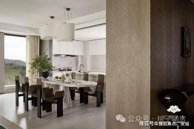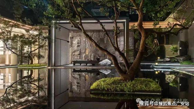 这座水庭也是一整面「水镜」,将中心的乌桕树、周围的超大白玻、精致的艺术雕塑都倒映其中。