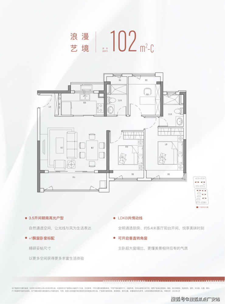 这个户型相信年轻人更喜欢,毕竟,哪个年轻人会拒绝270度采光的客厅呢!这套户型同样拥有约80%的高得房率、灵活机动空间等优点,而且布局上隐私性更强、窗墙比更高!主卧和次卧是完全隔断的,从归家动线上来看,主次卧的轨交动线几乎不重叠。这种设计很适合两代同住的家庭,因为很多年轻人因为下班晚,是不希望打扰到长辈的。南向窗墙比达到约41%-45%,空间通透感十足!租住过上海老公房的朋友很多都对高窗墙比有一定执念,这个户型相信打动了不少人的心!102m²的户型也很难让人不爱: