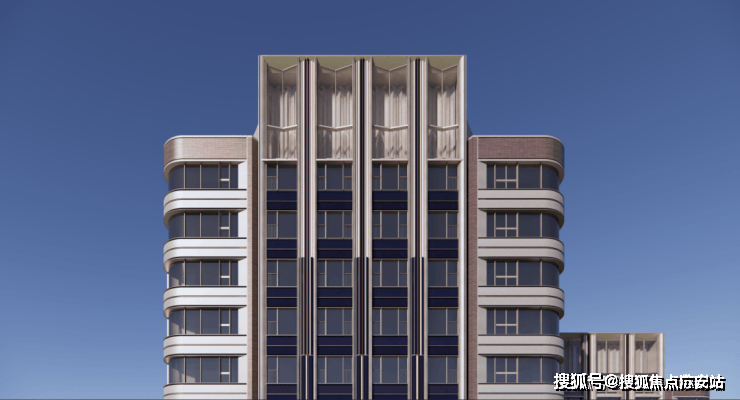 住宅立面颜色以珍珠蓝为核心,搭配香槟金、海派红,两侧还采用弧形设计,比方正的建筑看起来更柔和,也让视野更大化,实现约270°观景。