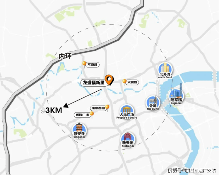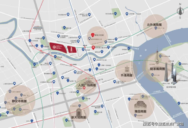 项目东侧华润苏河湾打造的中央公园,地下部分全部为城市商业,约800米左右静安大悦城、1站人民广场、3站黄陂南路(步行约60米新天地)、3站静安寺,轨交10分钟内便有繁华的商圈。