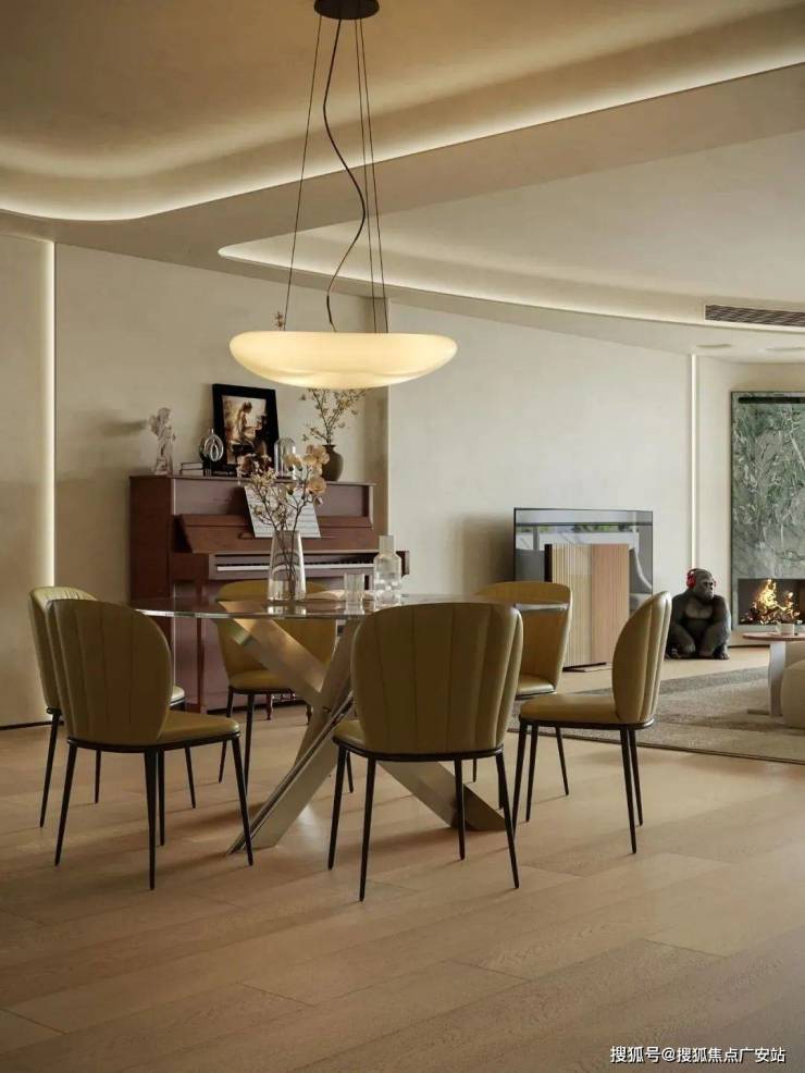客餐厅的主色调柔和温暖,不同色彩交叠营造丰富的层次,弧形的吊顶,勾勒空间的轮廓,也从吊顶和灯光的布置,无形中划分了空间的功能规划。