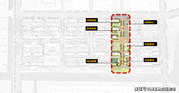 一街为活力商业街,通过纵向布局,在街道两侧配上丰富立体的商业,包括沿街商业、邻里中心、乐活商业街等,满足居民日常的需求。