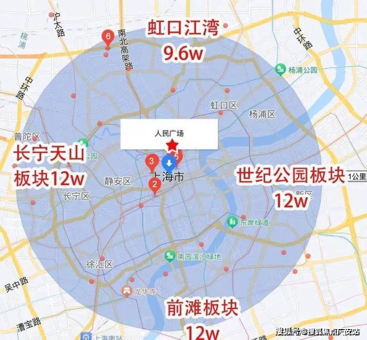 以人民广场8KM为半径,往南前滩板块均价已至12w/㎡,西边长宁天山板块均价12w/㎡,东边世纪公园板块也是12w/㎡。相较之下,北边江湾明显是价格洼地。