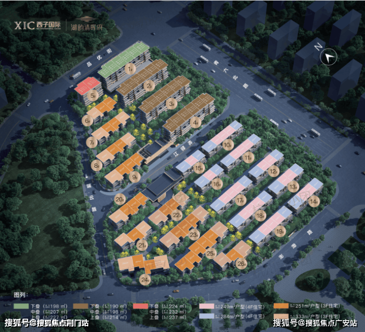 整盘是三层合院、四层排屋和六层上中下叠墅的规划,叠墅户型建面约190-237方,排屋户型建面约249-284方,合院户型建面约251-333方。