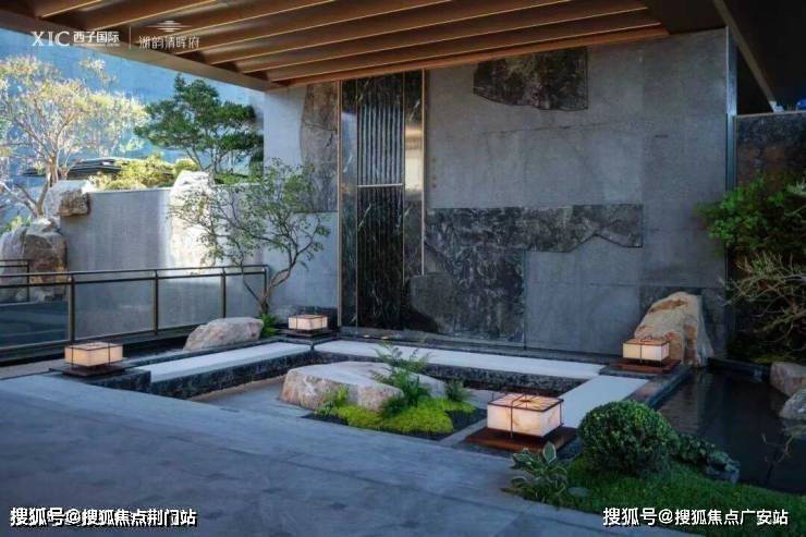 一般的大门都是直接连着入户大堂,但这里居然嵌入了一个方方正正的下沉式卡座,背后是流水潺潺,眼前有亭台游廊。