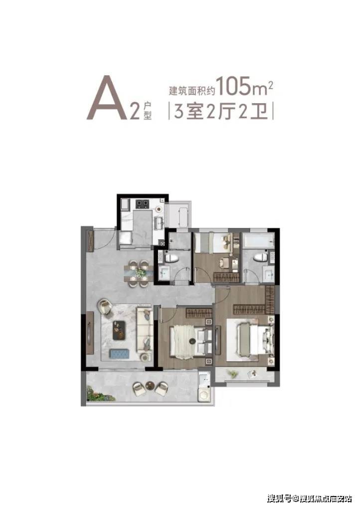 A2户型 105 ㎡3-2-2·正 | 三开间朝南,南北通透,生活更舒展,享多重逸趣·尊 | 独立卫浴、步入式衣帽间,点滴细节彰显生活尊崇·趣 | 餐客厨一体,U型厨房易操作,让下厨成为生活乐趣·阔 | 双开间阳台,尺度阔绰,赏立体景致,内外无界交融