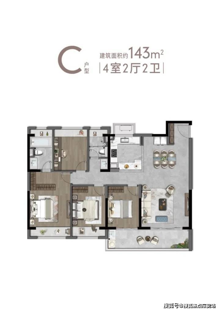 C户型 143 ㎡4-2-2·明 | 四开间朝南,全卧配备飘窗,采光优越,生活充满想象·奢 | 主卧套房设计,敞阔起居空间,私密性与尊崇感并重·智 | 外卫干湿分离,功能空间独立卫生,日常使用效率高·阔 | 餐客厨一体,超大厨房空间,容纳多人操作,顺畅便捷·敬 | 设独立老人房,尊重不同生活习惯,满足多元家庭结构