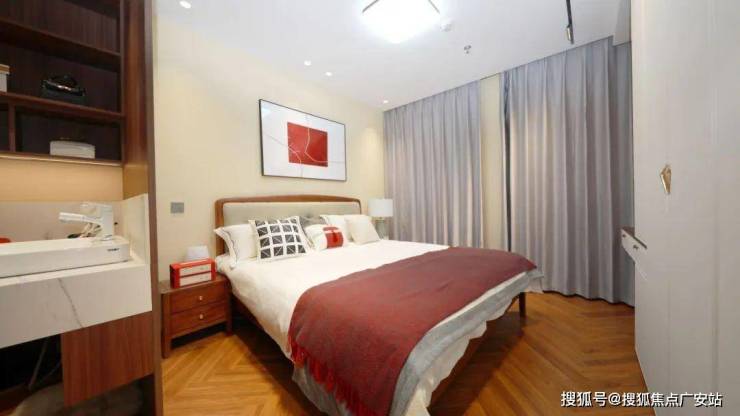 主卧整体空间布局规整、通透,无过多堆砌。以米黄墙面为基底,柔和、温暖,酒红色床尾巾与床头挂画的红色元素相呼应,在淡雅中添一抹亮色,如同宋画中巧妙点缀的色彩,不张扬却点睛。