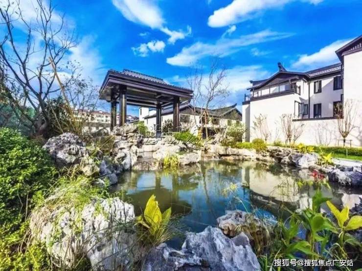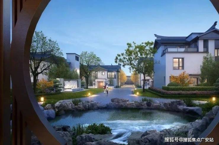 白墙黑瓦的视觉风格,中轴对称的大气格局,高地错落建筑造型,辅以亭台、叠水、乔木等中式景观布局,营造浓厚的中式宅院体验感。