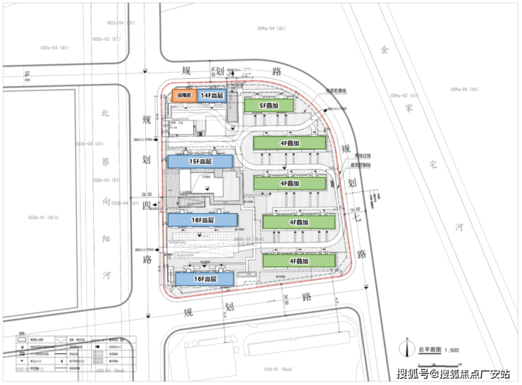 地块拟建4幢14-16层高层住宅,以及5幢4-5层多层住宅,配套公建用房和社区配套设施;地面没有停车位,全部人车分流。