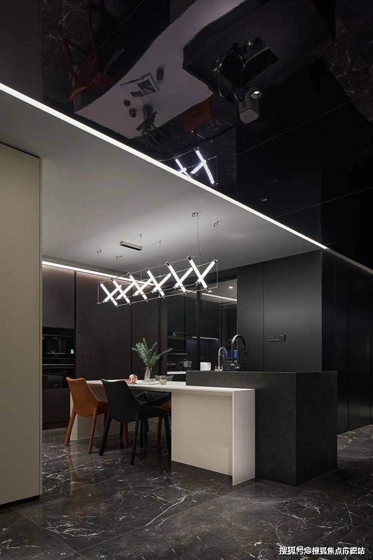 与客厅相比,餐厅对黑色的运用更为多元.设计师巧妙地运用不同材质,吊灯与精致器皿相得益彰,一幅城市墨画定格了时间,伴随着富有格调的三餐四季.