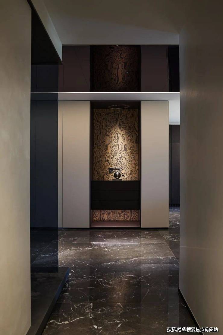 过道处,【爱力蒙特∙黑金帝国石】与木纹砖的巧妙过渡,暖色调的灯光赋予空间沉稳的气质,哑光暗色的柜体力求风格统一,彰显简净高级,恰到好处的场域共鸣,定格了人与空间最佳尺度的平衡.