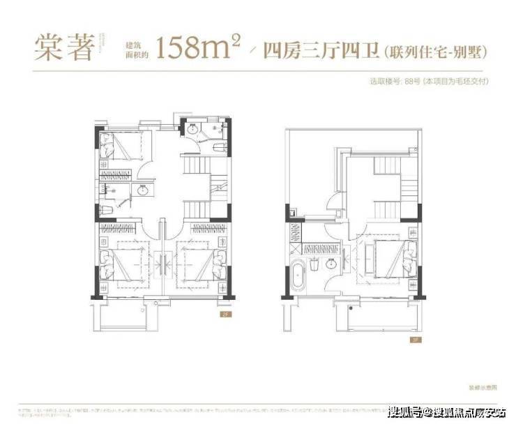 下叠户型4房2厅3卫,一层会客区,二层居住区,附带地下空间,可以根据主人喜好,定制成如健身房、酒窖、影音室、台球房等,任凭想象。