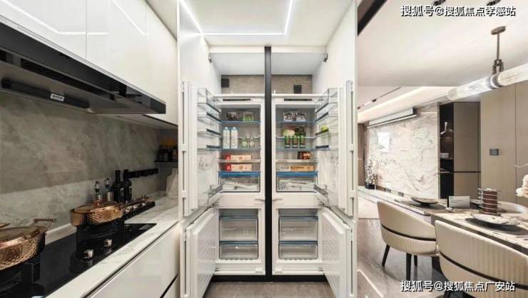 甚至连大部分项目不配备的冰箱也是交付标准,还特别配置了轨道插座、前端净水器和凉霸、吊轨金属玻璃移门,既美观又方便清理。