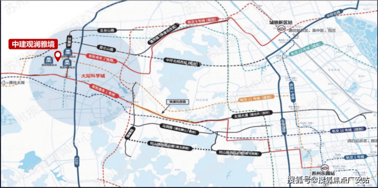 【主干路网】三纵:俞巷路、龙康路、通墅路;三横:昆仑山路(后期昆仑山路穿过大阳山隧道连接中环北线)、普陀山路、太湖大道;多通道直连科技城核心区及苏州市区;