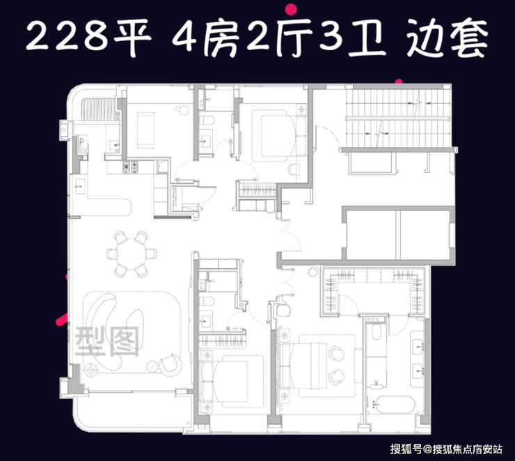边套228平4房3卫,总价2677—3794万, 空间感要强不少。