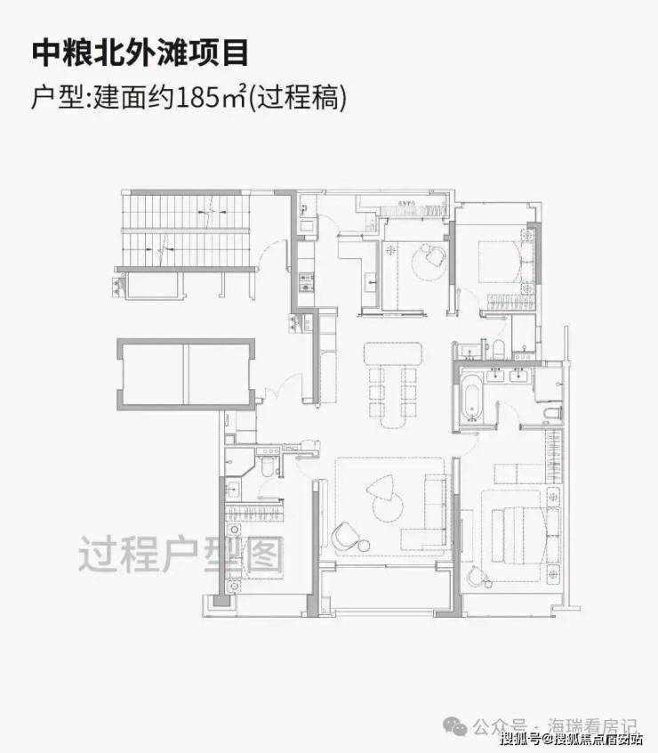 中间套185平4房3卫,总价2188—2804万, 采用四叶草布局,空间没有太多过道浪费,两个南向套房设计也比较实用。