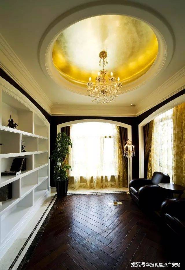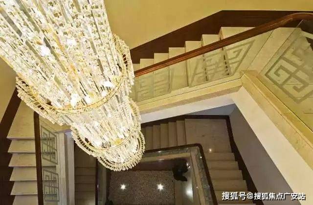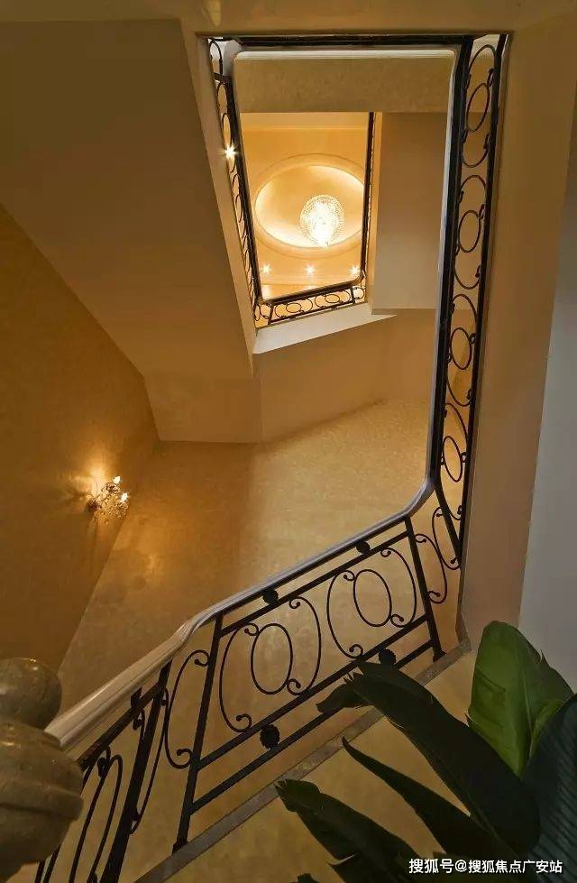楼梯采用顺时针螺旋设计,寓意顺气,暗含财运事业平步青云,楼梯顶部为屋顶挑高艺术穹顶,可悬挂大型吊灯,气派华丽。