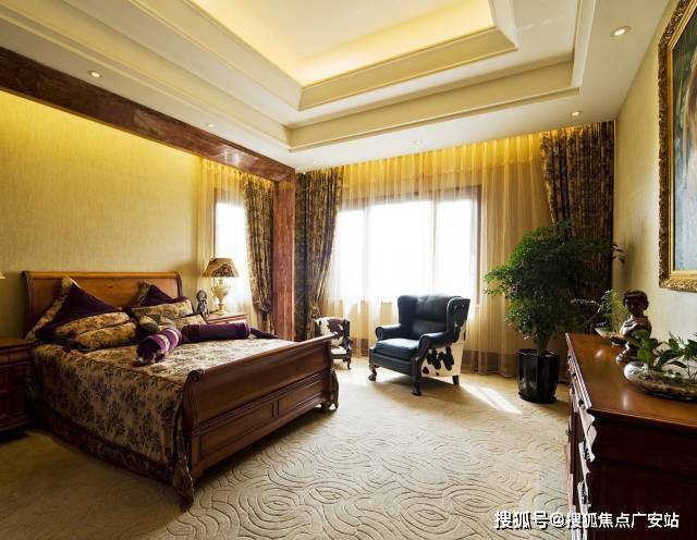 卧室位于套房南侧,面宽5.3米,进深5.1米,呈正方形,不仅适合家具摆放,风水学也认为方形卧房更利于藏风聚气,提升主人运势。