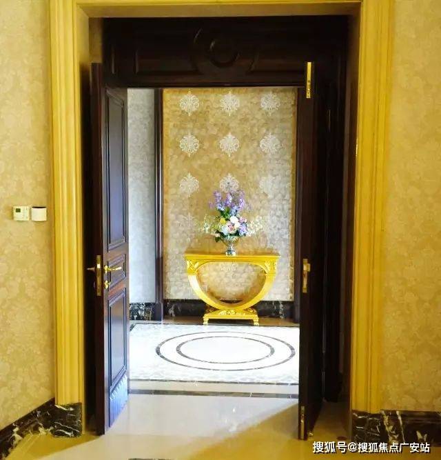 再看入户大门,1.8米双开门,高门大户,与文艺复兴时期梁柱、拱圈搭配,庄严对称。六级台阶拾阶而上,象征家庭顺利和谐,事业蒸蒸日上。