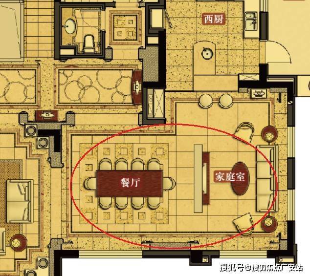 餐厅位于客厅东侧,处东南方位,双面采光,是太阳升起最早照射的地方,也是风水吉位,给人以勃勃生机之感。整个区域面积约45平,面宽约8.6米,进深5米,配20人圆形餐桌仍显阔绰,与其相连的是近20平的家庭休息室,可以放一组沙发配电视柜,在等待用餐时,亲朋或小孩可在此休息聊天。