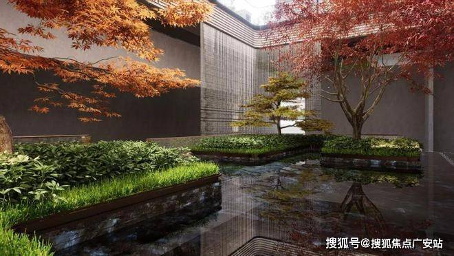 下沉式庭院宽约18米、进深约9.5米,通过水帘连通上下景观,水晶砖景墙与层层叠水形成视觉焦点,夜晚灯光下宛如艺术馆。