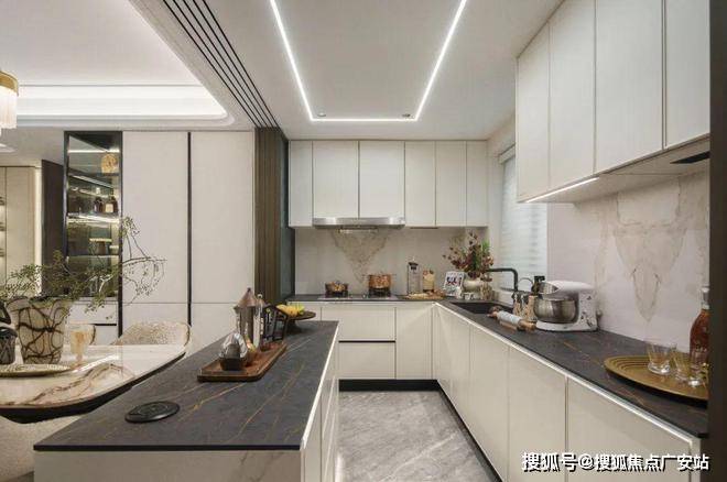 厨房配备美诺(Miele)抽油烟机、灶具、洗碗机,搭配博洛尼定制橱柜、达克密瓷岩板,台面则选用西班牙DEKTON品牌,耐高温、抗腐蚀。