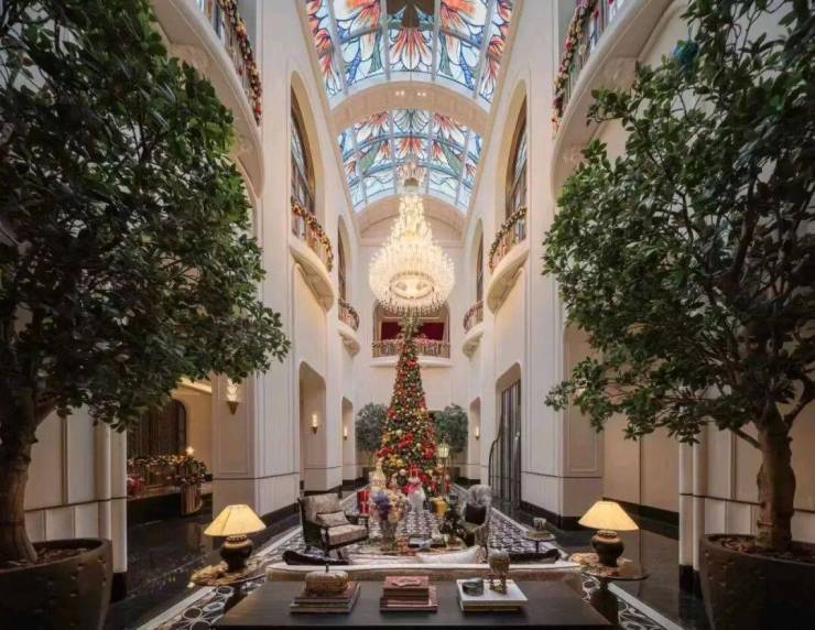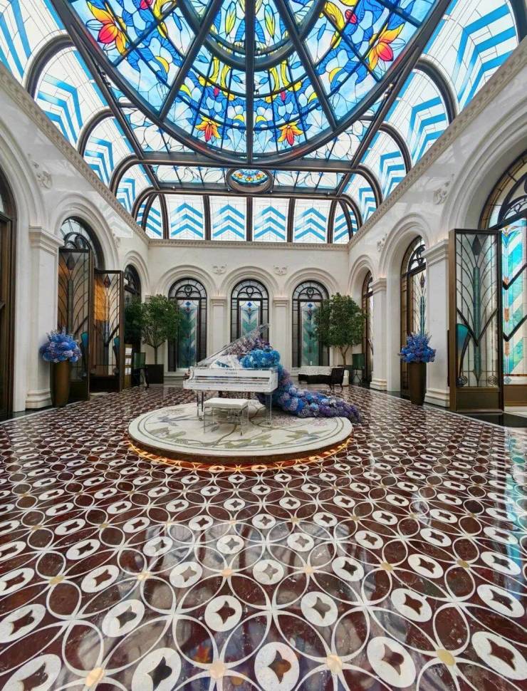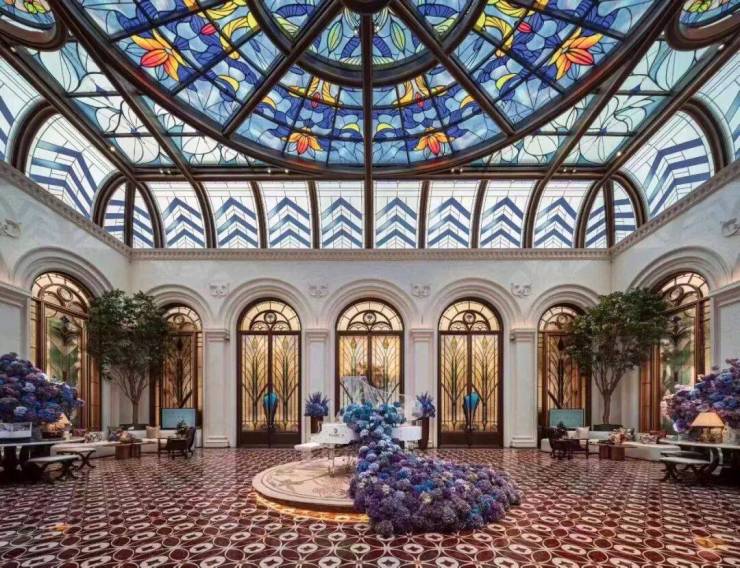 彩绘玻璃穹顶巧妙地散射着柔和天光,流光溢彩的艺术美韵在空间中浮动。艺术拱门与浮雕墙面交错排列,深刻诠释了海派建筑兼容并蓄的精髓。琴声悠扬,繁花烂漫,蓝紫色渐变色调描绘着季节的流转,共同构筑了一个融合自然、美学与温情的社交场域。
