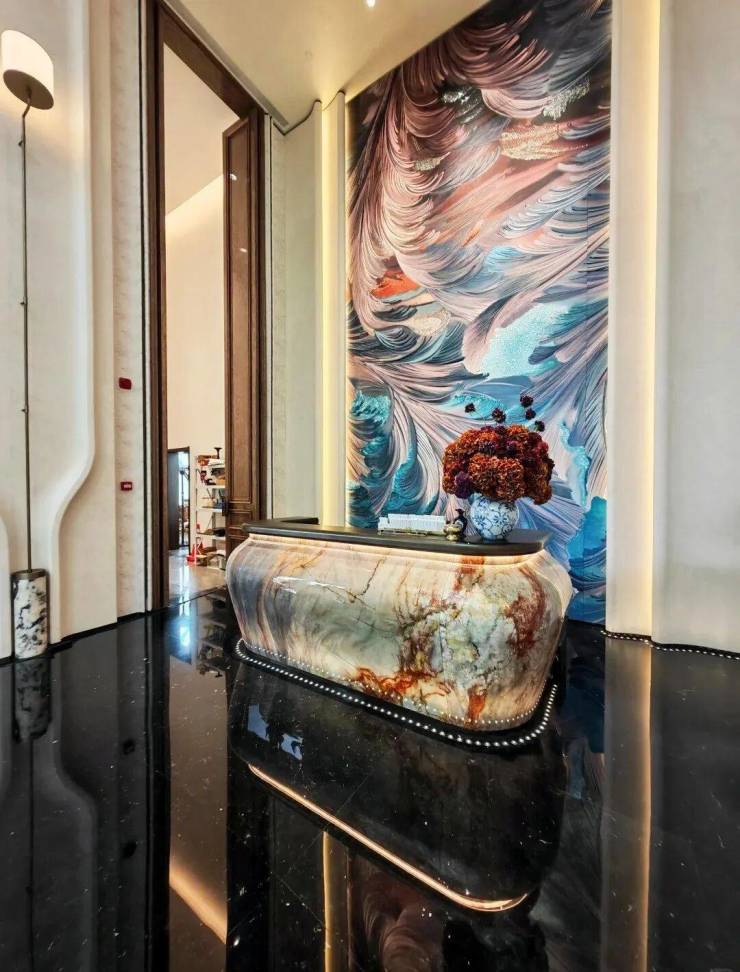 「繁花立面」以金属曲面层层叠叠交织,定格玉兰绽放的永恒瞬间,传承海派建筑的经典秩序。曲面柱廊与阵列式柱廊共同撑起恢弘天幕,彰显庄严气度。萃取东方色谱精粹,甄选丝箔流金、东方雅铜、青釉奢蓝,以当代笔触晕染立面,让传统色彩在空间中生长为永恒诗意。入户门头形取和平饭店经典拱门,配以碧绿色天然石材门套与彩玻花窗,重现百年外滩门廊的尊崇仪式感。