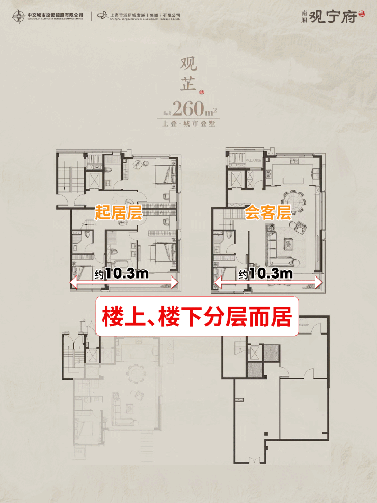 下叠户型以多维空间规划、极致尺度设计与全龄化布局,打造高净值家庭专属的墅居空间,兼具功能性与舒居感。