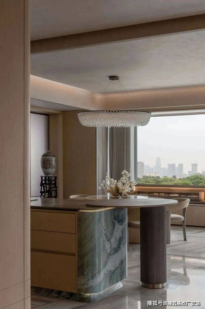 餐厅的设计同样让人眼前一亮,圆形的餐桌搭配精致的吊灯,营造出温馨浪漫的用餐氛围。旁边的吧台设计,既可以作为早餐台,又能在朋友聚会时作为调酒区,实用性与美观性兼具。中邮揽奥云璟售楼处电话☎:4008558224【预约☎】