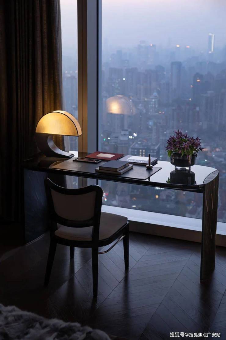 走道端处香槟色金属雕塑,形类城市高楼,又若恋人彼此依偎;全采光套房拥揽白日上海黄浦的忙碌、繁华,也收藏夜晚灯火阑珊的宁静、美好。