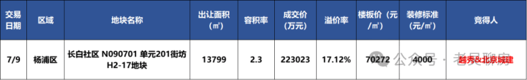 2024年7月9日,上海第三批次土拍中,北京城建与越秀地产组成的联合体以高达22.3亿元的价格成功竞得杨浦长白社区N090701单元201街坊H2-17地块(即领翠滨江),其成交的楼面价格定格在70272元/平方米,溢价率约17.12%,装修标准不低于4000元/㎡。