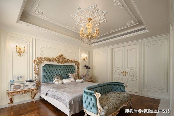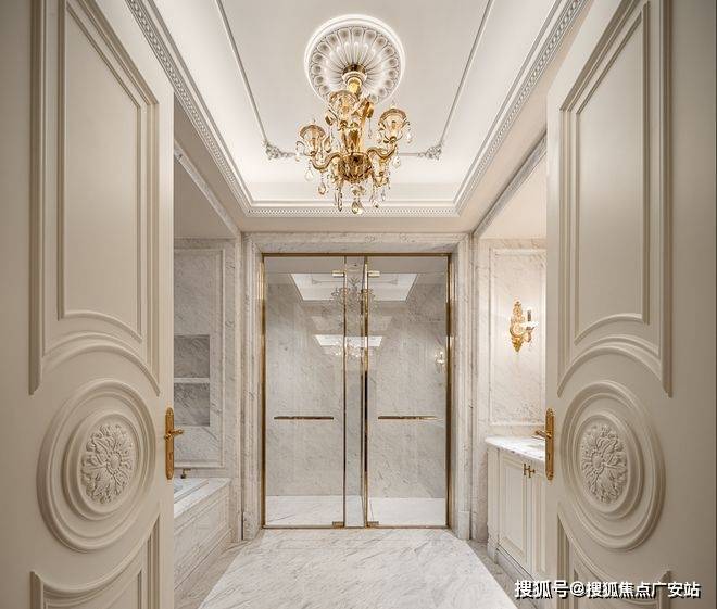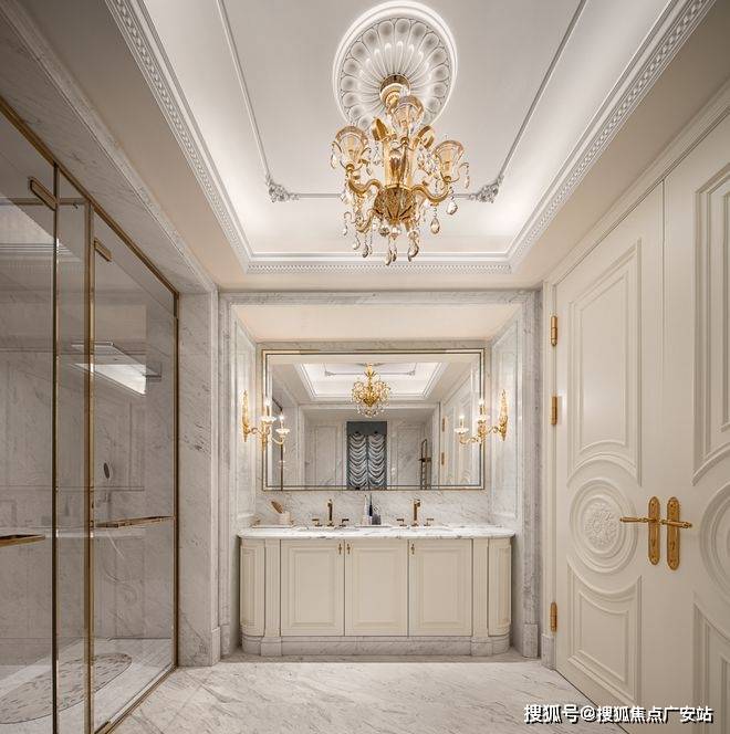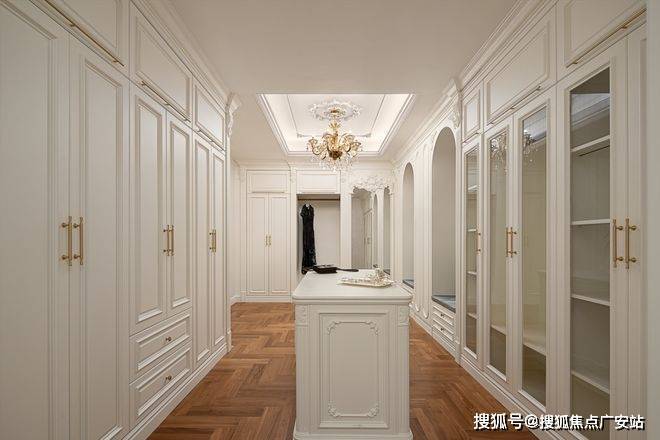 衣帽间通过对称布局与精致雕花细节,强化法式轻奢的仪式感,同时满足大容量储物需求。