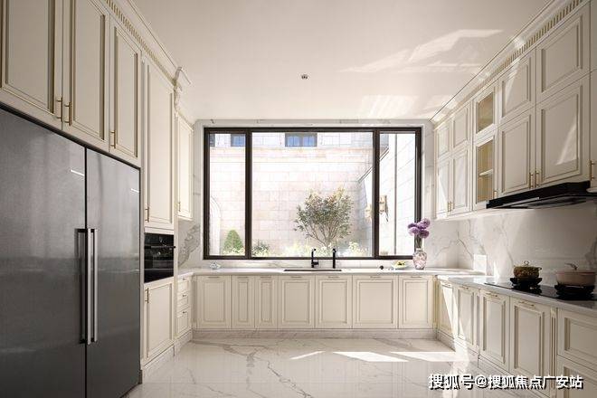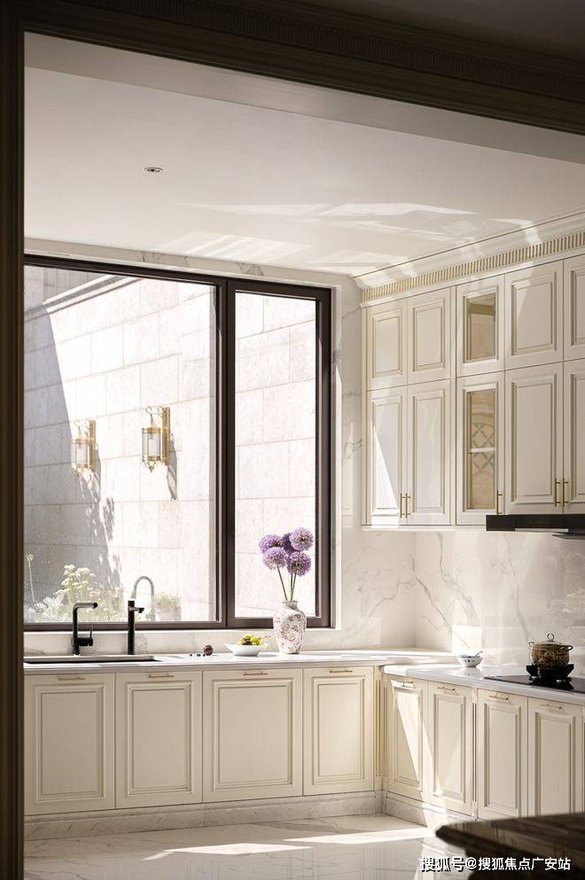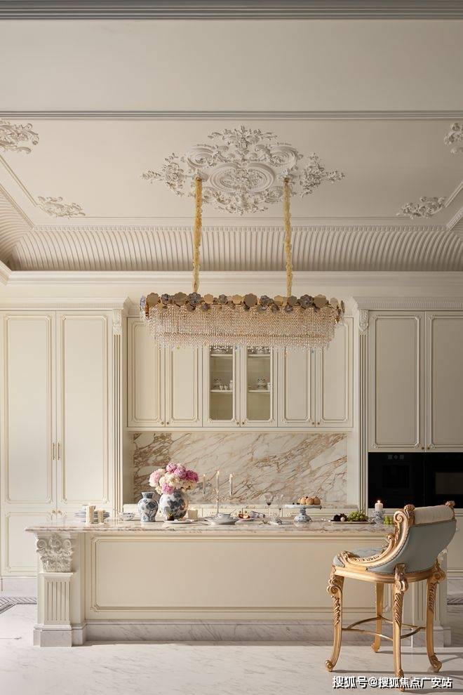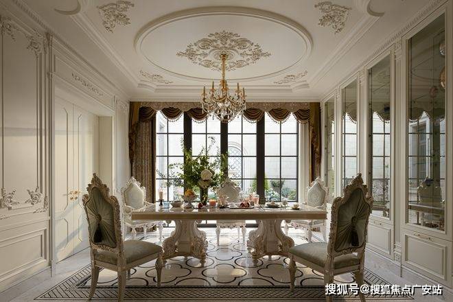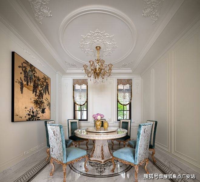 餐厅承载家庭烟火与相聚时光,延续法式轻奢风格,细节暗藏巧思:别致吊灯、餐桌雕花或墙面艺术画,让用餐不再是简单饱腹,而成为充满仪式感的家庭聚会。