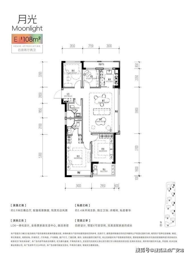 还有建面约108方东边套户型,做到了同级少有的4房2卫巨幕客厅设计。