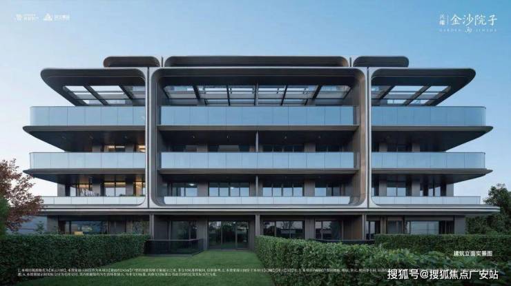 大面积的玻璃幕墙,搭配木纹铝板等暖色系材质,弧线及立面型材工艺的运用,汇成浪漫的美拉德暖色美宅,这是兴耀标识性的设计——「艺术级流体无界屏」,与金沙文教区的气质交相辉映。