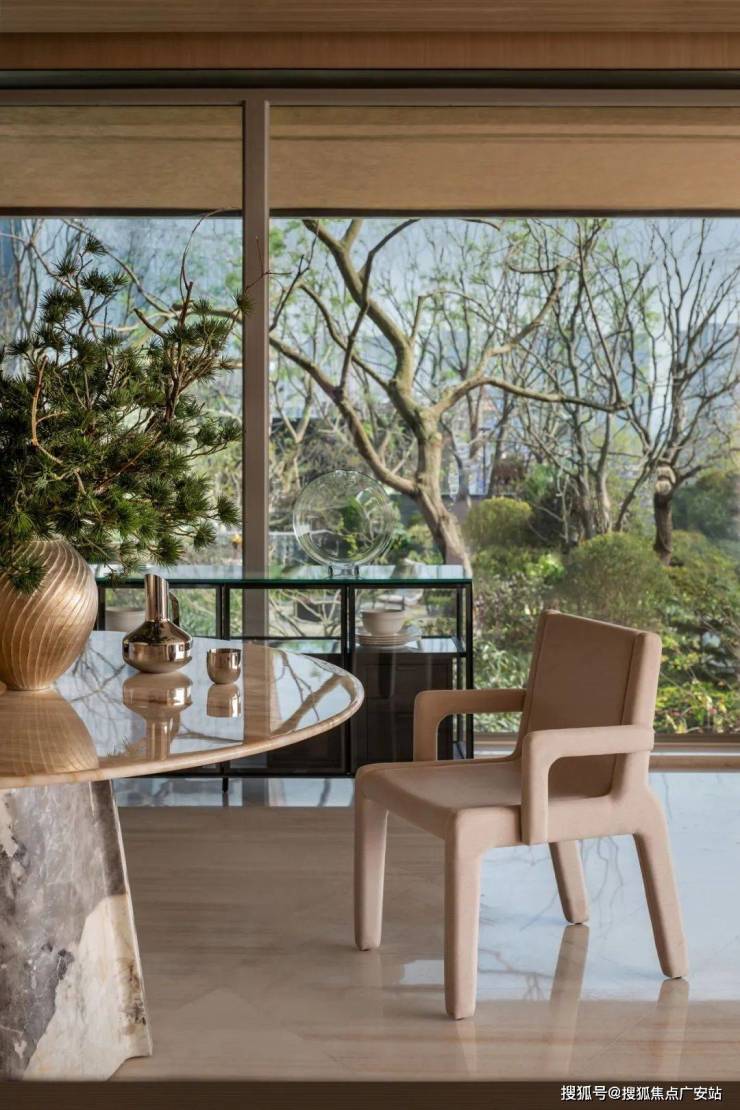 空间似一张温柔的宣纸铺展开来,金属与皮革、石材与绿植,刚与柔、曲与直,写意空间里的诗意山水,极致简化的线条与体块共筑一处静谧场域。